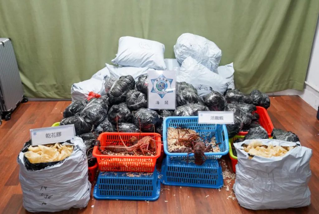 海關密切留意水客活動的發展態勢,加強情報收集及分析,持續開展打擊行動。本月10日,海關搗破一個位於北區的水客活動散貨點,查獲一批活龍蝦及乾花膠,2人違法被查。