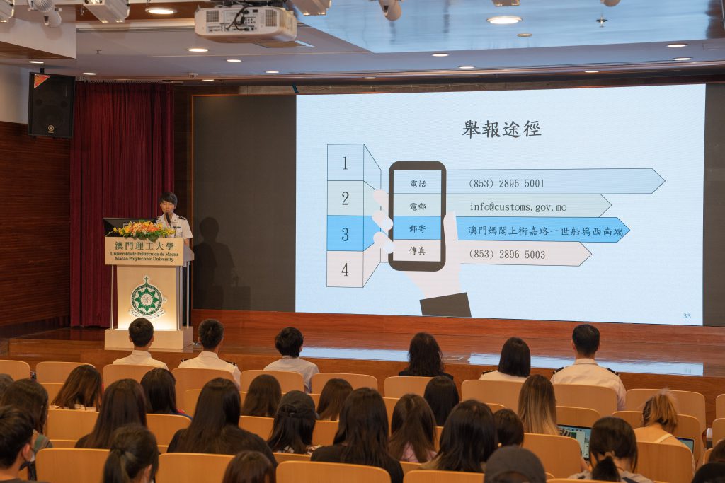 为向新生代宣扬保护知识产权的重要性,促进青年的守法意识,海关于2023年先后到教业中学、澳门理工大学及菜农子弟学校举办保护知识产权讲座,向学生讲解相关法律知识,呼吁学生支持原创,拒绝盗版,超过400名师生参与。