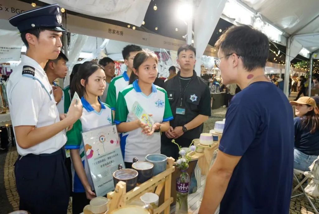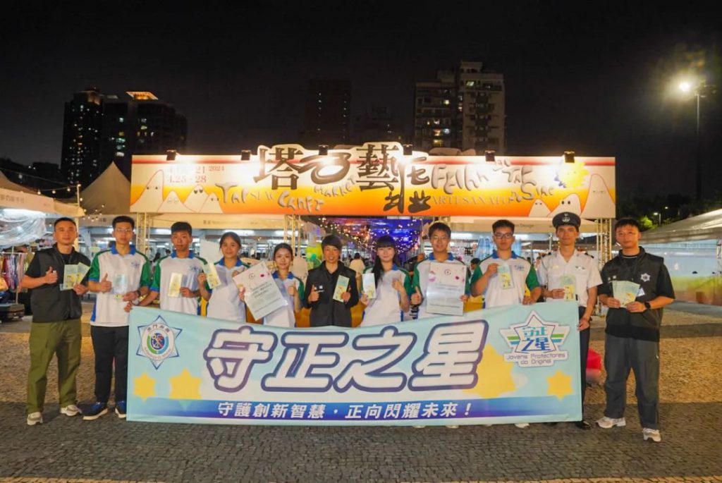 海關人員帶領「守正之星」學員前往塔石廣場,向塔石藝墟的商戶派發宣傳小冊子,一同宣講保護知識產權的守法訊息,同時讓學員進一步瞭解本澳原創產業,明白保護知識產權的重要性。