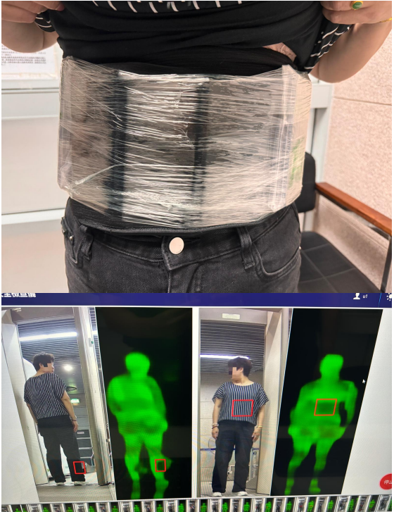 於10日晚上,關員在關閘口岸出境旅客檢查區發現一名通關女子步履異常,眼神迴避,懷疑其身上藏有可疑物品,經使用太赫茲人體成像安檢系統詳細檢查,發現該名女子將50部舊手提電話及9隻舊電子手錶綁藏於腰部、大腿及小腿內側,試圖偷運出境。