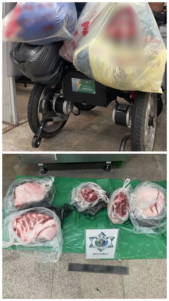 7日上午,兩名本地男子先後乘坐電動輪椅經關閘口岸無申報通道入境本澳,關員見有人形跡可疑,且輪椅椅背載有大量物品,故截停要求前往檢查區受檢。經詳細檢查,關員於兩人電動輪椅所載物品中分別查獲31公斤及32公斤豬肉,全數不具備有效的進口申報文件。調查期間,兩人均供稱涉案豬肉是協助他人攜帶,而事成後將獲支付報酬。由於兩案懷疑涉及水客活動,海關已開展進一步調查。