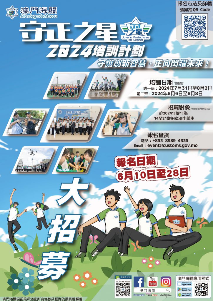 为向青少年灌输更广泛的知识产权法律知识,培养青少年正确人生观及“以身作则”的正向思维。澳门海关今年继续开展“守正之星”培训计划。招募对象为于2024年度年满14至21歳的本澳中学生,报名日期由即日起至6月28日,欢迎踊跃报名。