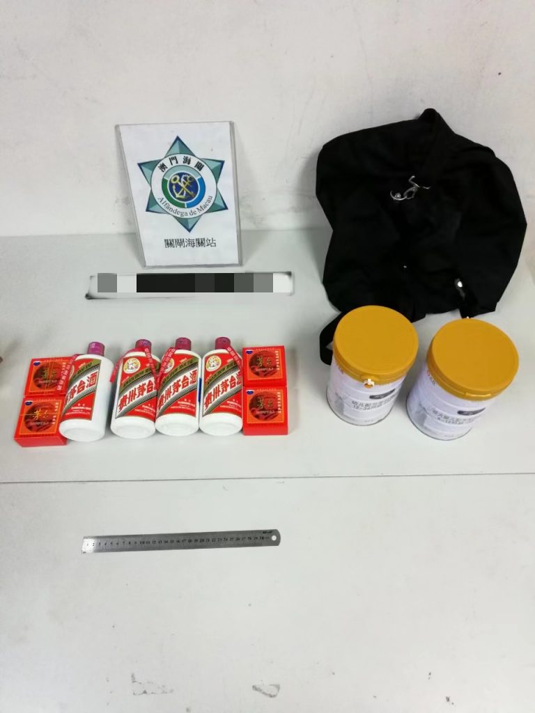 14日下午,海关人员于关闸口岸出境旅客检查区,发现一名内地男子形迹可疑,故对其进行截查。经检查后,在该名男子的背包内发现2支白酒、4个白酒空盒及2罐奶粉;海关人员察觉有异,故要求涉案男子打开奶粉罐,再发现2个奶粉罐内各藏有1支中国白酒,全数不具备有效的出口申报文件,企图偷运出境。