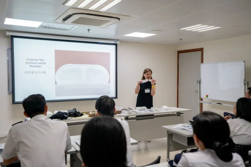 讲解会上,两品牌之鉴定人对旗下产品种类、包装组成、设计特点及防伪标志等多方面进行专业讲解。期间,主讲者亦与关员互动交流,透过展示真伪产品进行对比,指出假冒产品的常见特征,如材质、标识、细节处理等方面的差异,让海关人员深入了解和认识有关产品独有的防伪技术及特征,提升鉴别产品真伪的技巧及能力,履行海关保护知识产权的职责。