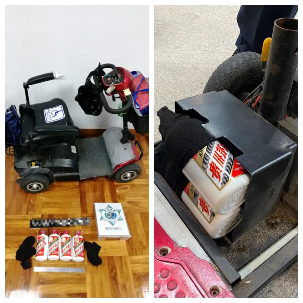 Na tarde do dia 9, o pessoal dos SA em serviço encontrou no Posto Fronteiriço das Portas do Cerco, um indivíduo do sexo feminino sentada numa cadeira de rodas eléctrica que estava a fazer a passagem fronteiriça, visto que ela evitou, de propósito, o contacto visual com o pessoal alfandegário, os movimentos anormais levaram à suspeita de que a mesma estava a esconder artigos suspeitos. Após uma inspecção mais profunda, verificou que a memsa tinha transformado a cadeira de rodas eléctica para esconder as 4 garrafas de vinho branco chinês no compartimento oculto após transformação com a intenção de transportar os vinhos em questão para fora de Macau.