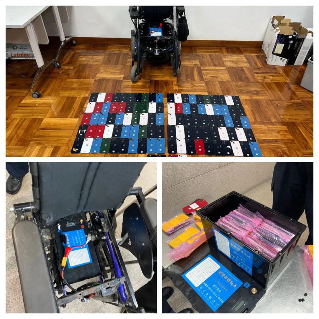 Na tarde do mesmo dia, o pessoal dos SA em serviço encontrou no Posto Fronteiriço das Portas do Cerco, mais um indivíduo do sexo feminino sentado numa cadeira de rodas eléctrica que estava a fazer a passagem fronteiriça com uma atitude e movimentos muito nervosos e anormais, os quais levaram à suspeita de que a mesma estava a esconder artigos suspeitos. Após uma inspecção mais profundas, verificou-se que a mesma tinha esvaziado a caixa da bateria da cadeira de rodas eléctrica para esconder as 104 unidades de telemóveis usados neste espaço com a intenção de transportar os vinhos em questão para fora de Macau.