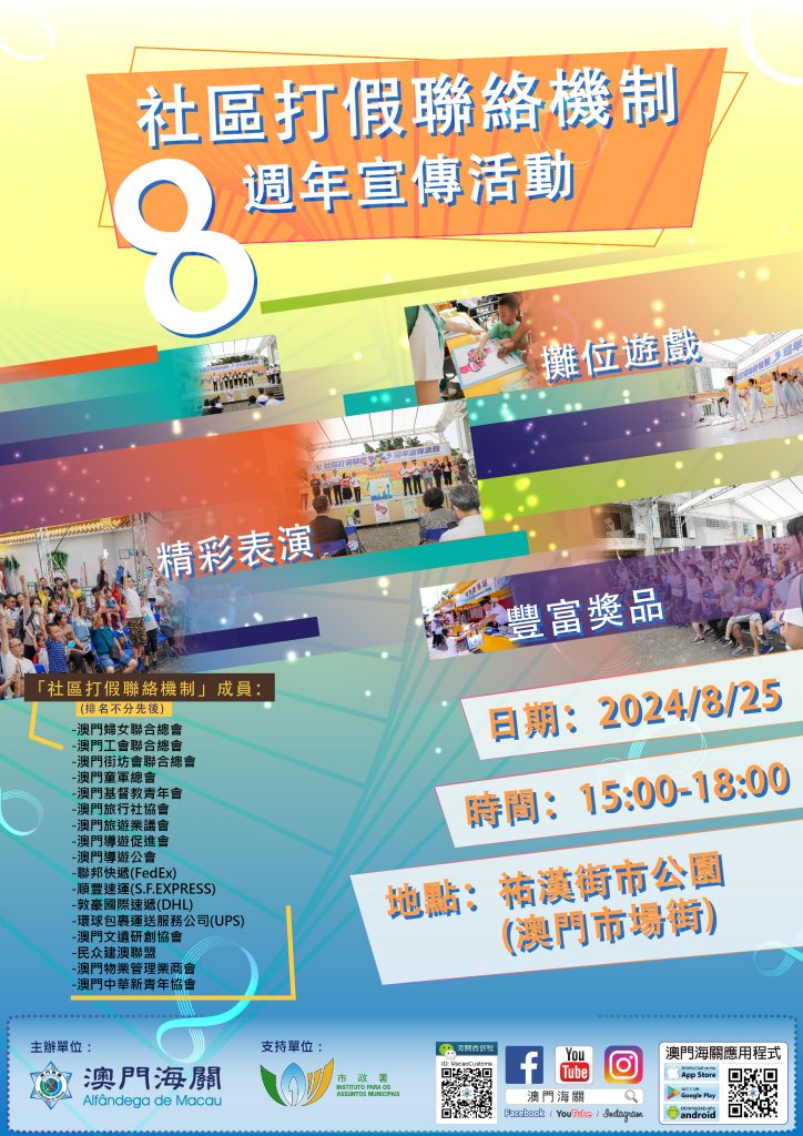 今年是澳門海關成立“社區打假聯絡機制”八週年,為進一步宣揚保護知識產權的理念,提高市民大眾的守法意識,海關將於8月25日(星期日)下午3時在澳門市場街祐漢街市公園舉辦社區宣傳活動,現場設有攤位遊戲及多項表演活動,更有豐富獎品,同場進行“保護知識產權”創作比賽頒獎儀式,歡迎全澳市民前來參與。