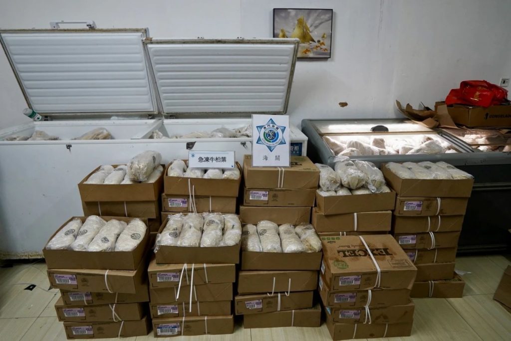 海关根据早前接获举报,以及对近日截获偷运个案作分析及追踪调查,锁定市内的怀疑供货点。于24日下午,海关人员对北区某地铺进行巡查,期间发现该地铺有从事水客活动迹象,随即展开执法行动并截获1名现场负责人,同时在该地铺内查获急冻牛柏叶1200公斤,货值约14万4千澳门元,并不具备有效的进出口申报文件。