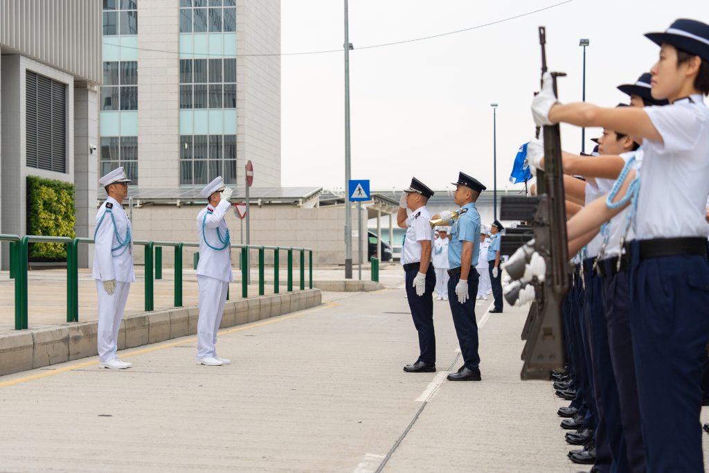 在海關關長黃文忠帶領下,海關一眾領導、主管人員及儀仗隊在海關總部大樓一同舉行升旗儀式。