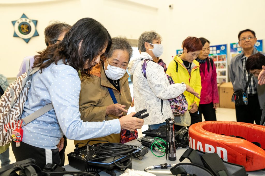 参观期间,由潜水队人员讲解在海上执勤及救援工作中常用的潜水装备、通讯设备、水陆两用车、水上电单车及橡皮艇等设备的操作和应用,同时安排参观者近距离接触和亲身体验。