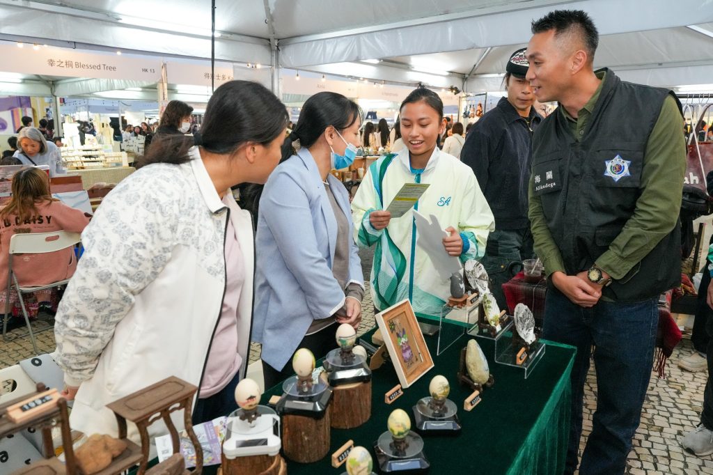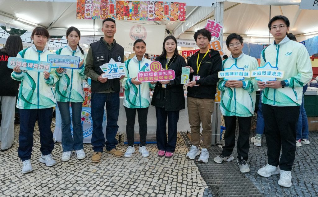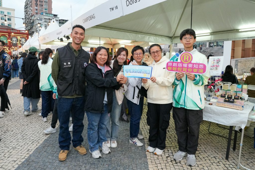 「守正之星」學員在海關人員的帶領下前往塔石廣場,向塔石藝墟的攤位經營人派發宣傳小冊子,一同宣講保護知識產權的守法訊息,同時讓學員進一步瞭解本澳原創產業,明白保護知識產權的重要性。