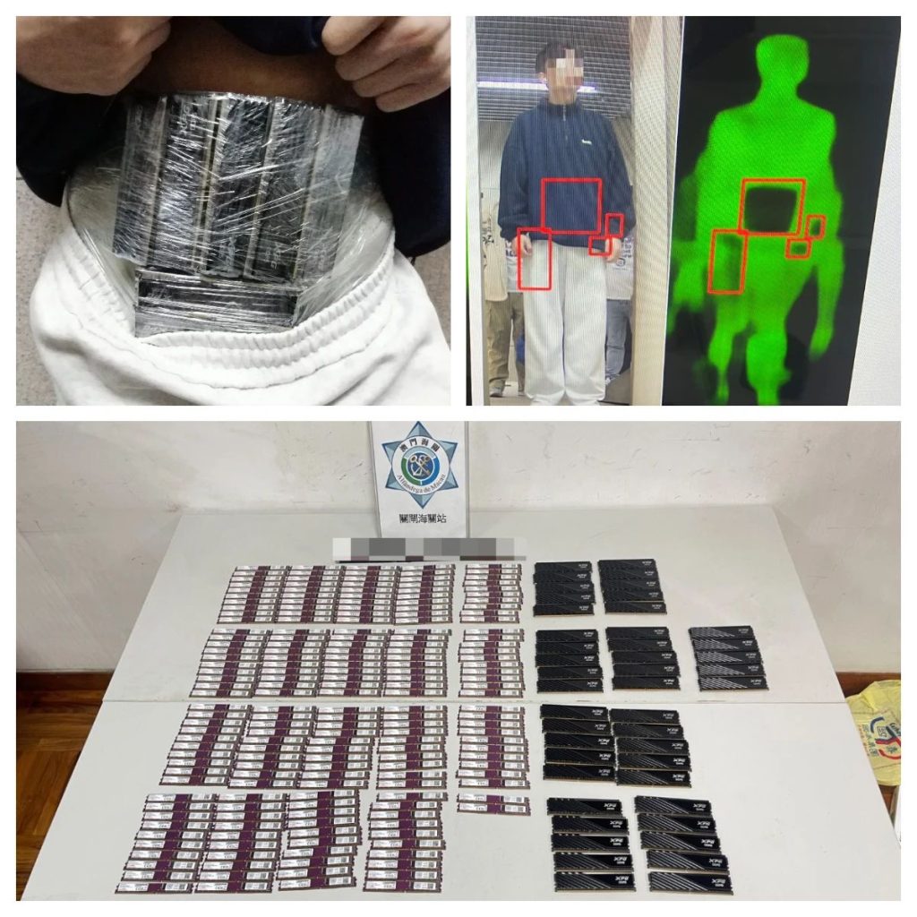 於11月29日晚上,海關人員在關閘口岸出境旅客檢查區分別截獲兩宗水客藏身個案,經使用太赫茲人體成像安檢系統作檢查後,發現兩名通關男子將電腦記憶體藏於腰間及小腿兩側,試圖偷運出境,合共查獲474件電腦記憶體。