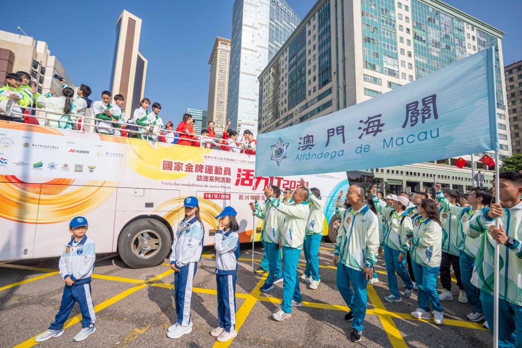海关守正之星成员与多名国家级金牌运动员一同登上双层开篷巴士参与公益金百万行活动,为参加步行人士加油打气。