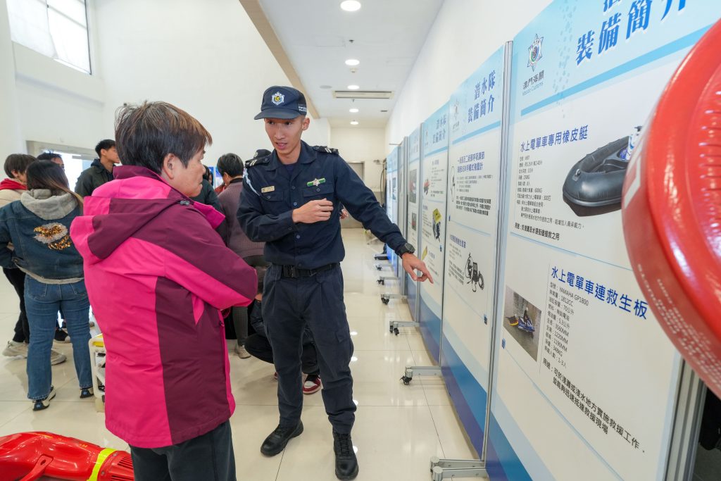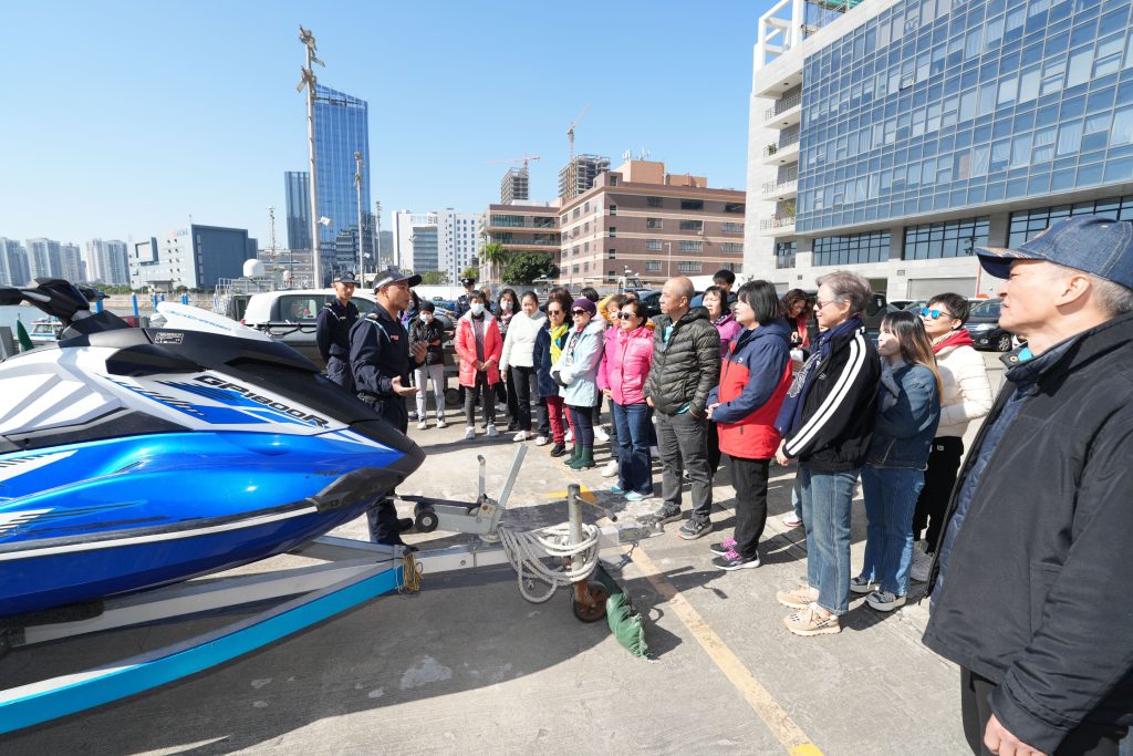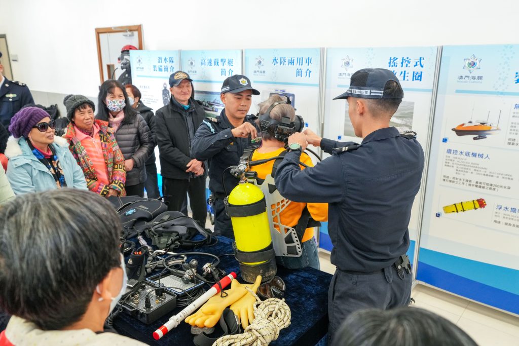 参观期间,由潜水队人员讲解在海上执勤及救援工作中常用的潜水装备、通讯设备、水陆两用车、水上电单车及橡皮艇等设备的操作和应用,同时安排参观者近距离接触和亲身体验。