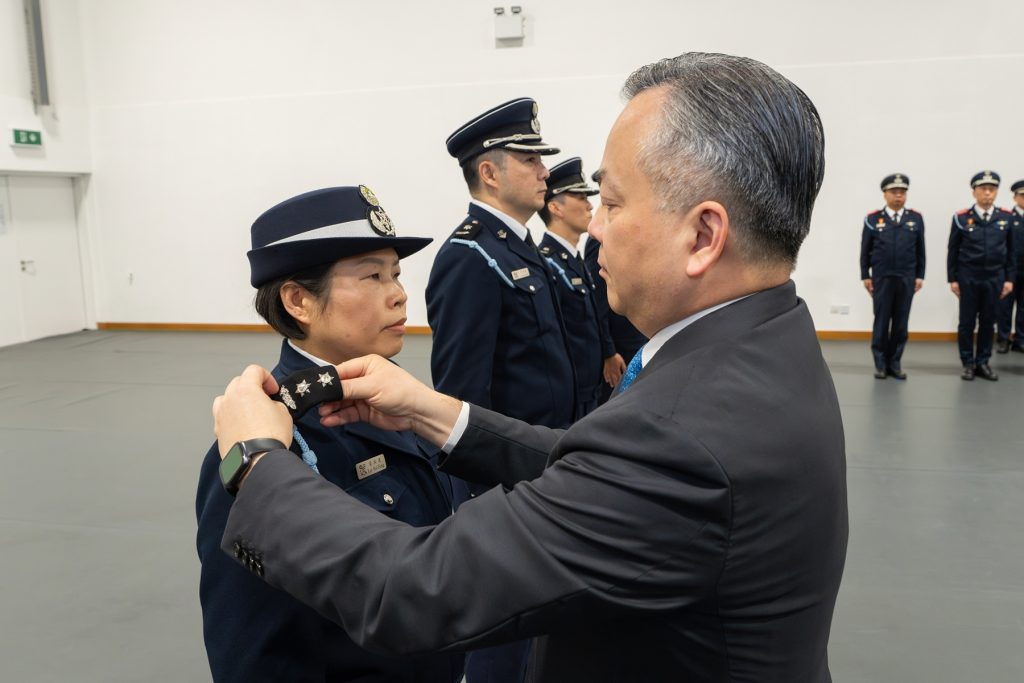 A colocação da nova platina pelo Director-geral, Adriano Marques Ho, ao pessoal promovido