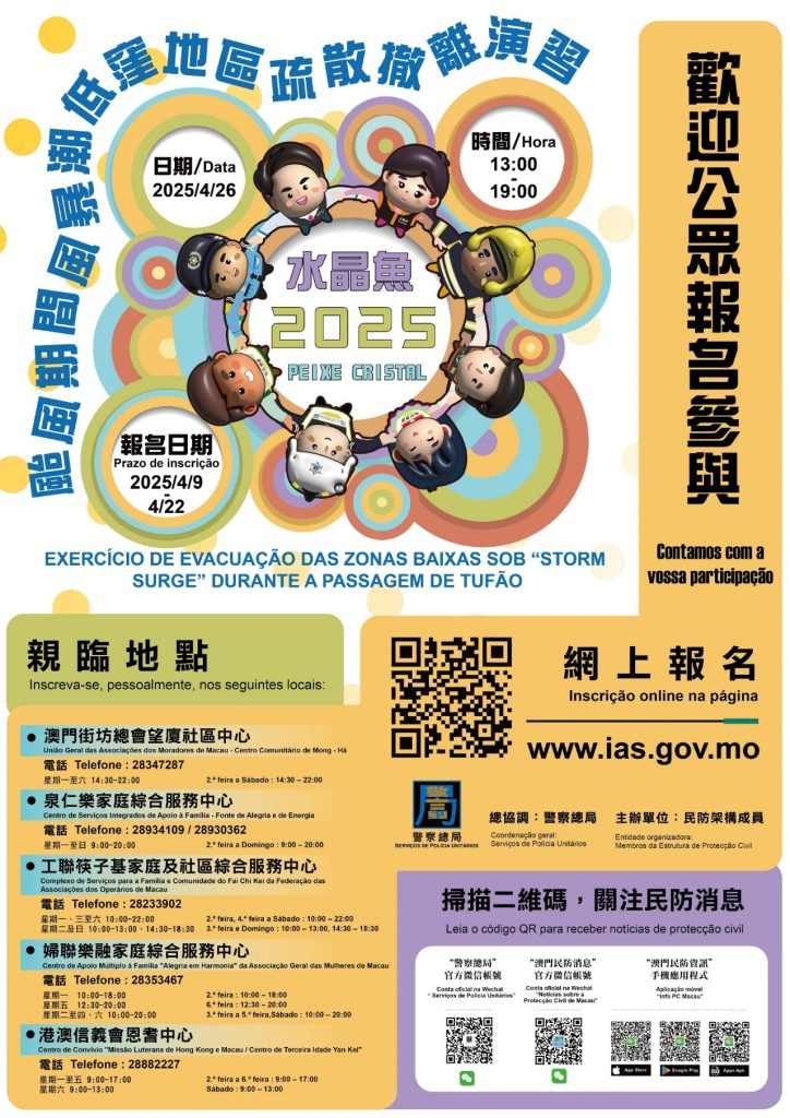 有意参与4月26日“水晶鱼2025”民防演习的市民,由即日起至4月22日,可登入社会工作局网页 www.ias.gov.mo 进行网上报名,或亲临澳门街坊总会望厦小区中心、泉仁乐家庭综合服务中心、工联筷子基家庭及小区综合服务中心、妇联乐融家庭综合服务中心,以及港澳信义会恩耆中心进行报名,欢迎市民踊跃参加。