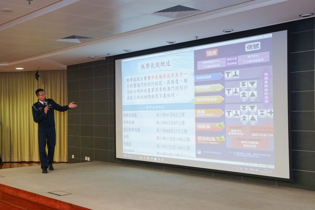 Na sessão em questão, os representantes dos SPU, dos SA, da Direcção dos Serviços Meteorológicos e Geofísicos e do Instituto de Acção Social (IAS) apresentaram, respectivamente, aos residentes desta zona os conteúdos sobre o regime jurídico da protecção civil, o Plano de evacuação das zonas baixas em situação de Storm Surge, conhecimentos relacionados com meteorologia e a localização dos Centros de Acolhimento de Emergência.