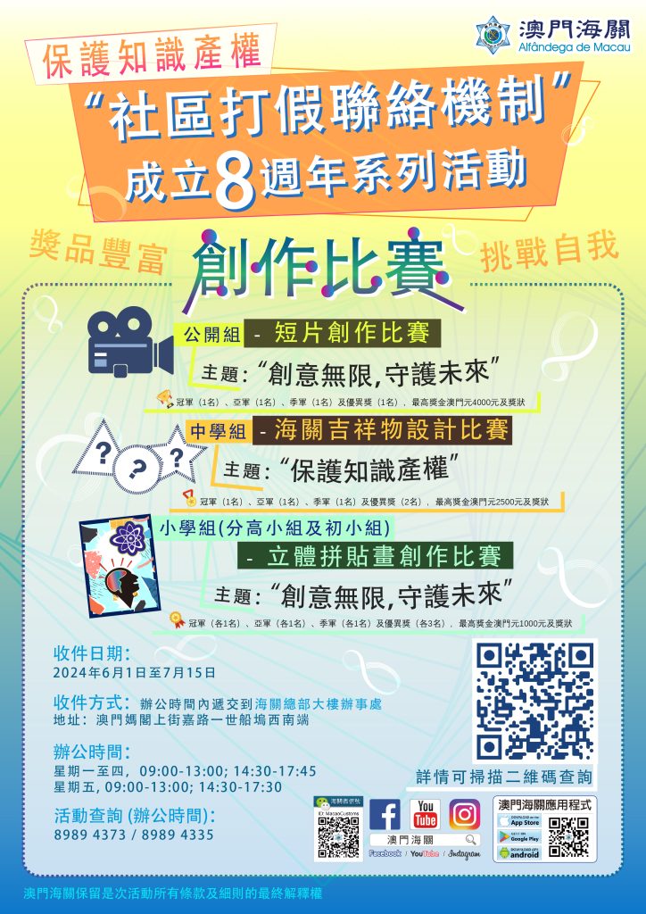 2024年为「社区打假联络机制」成立八周年,海关以「创意无限,守护未来」为主题,举办短片创作及立体拼贴画创作比赛,以及以「保护知识产权」为主题,进行海关吉祥物设计比赛,向青少年及公众推广保护知识产权的重要性,得到广大市民踊跃参与。