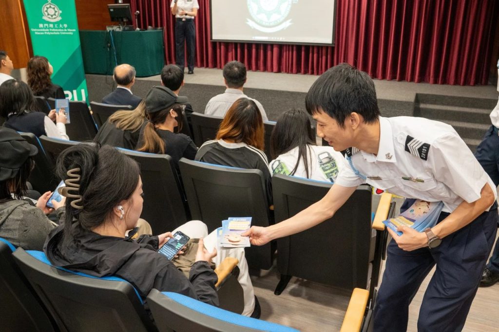 同場海關人員亦向學生們派發宣傳小冊子,提供海關舉報渠道,共同攜手做好保護知識產權的工作。出席的代表還包括經濟及科技發展局知識產權廳廳長鄺信昌、澳門理工大學阮鳳蓮主任等。