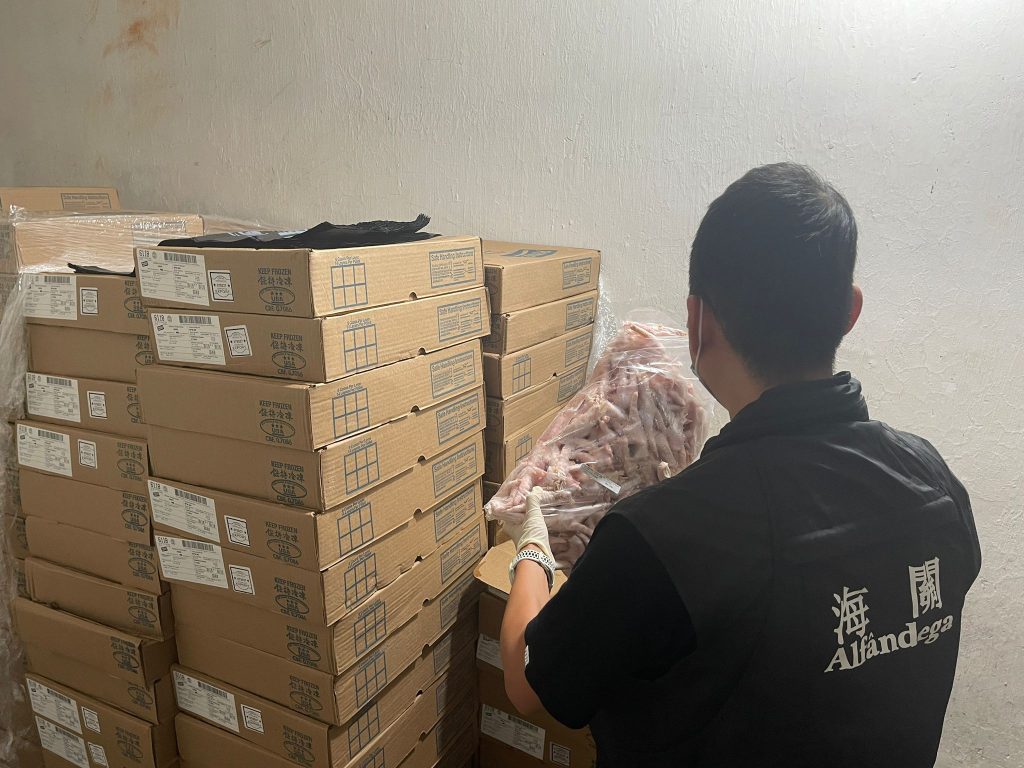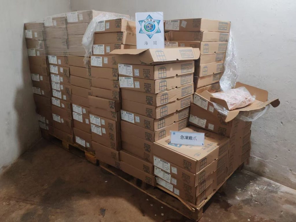 海關根據水客活動發展態勢,結合情報收集及分析,對水客散貨點加強巡查,持續打擊水客活動。本月28日下午,澳門海關於市內巡查期間發現北區一個懷疑水客活動散貨點,即時對有關單位採取行動,查獲不具備進口文件的急凍雞爪約660公斤,貨物市值約1萬5千澳門元,1人違法被查。