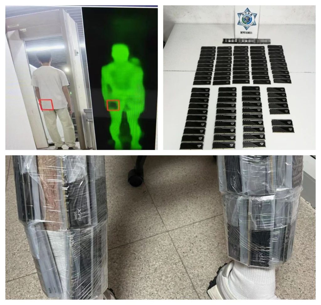 于6月20日下午,海关人员在关闸口岸出境旅客检查区发现一名可疑男子,其行迹怪异,怀疑藏有可疑物品。经对其进行详细检查后,发现该名男子将共87件计算机内存缠于腰间及腿部,试图偷运出境。