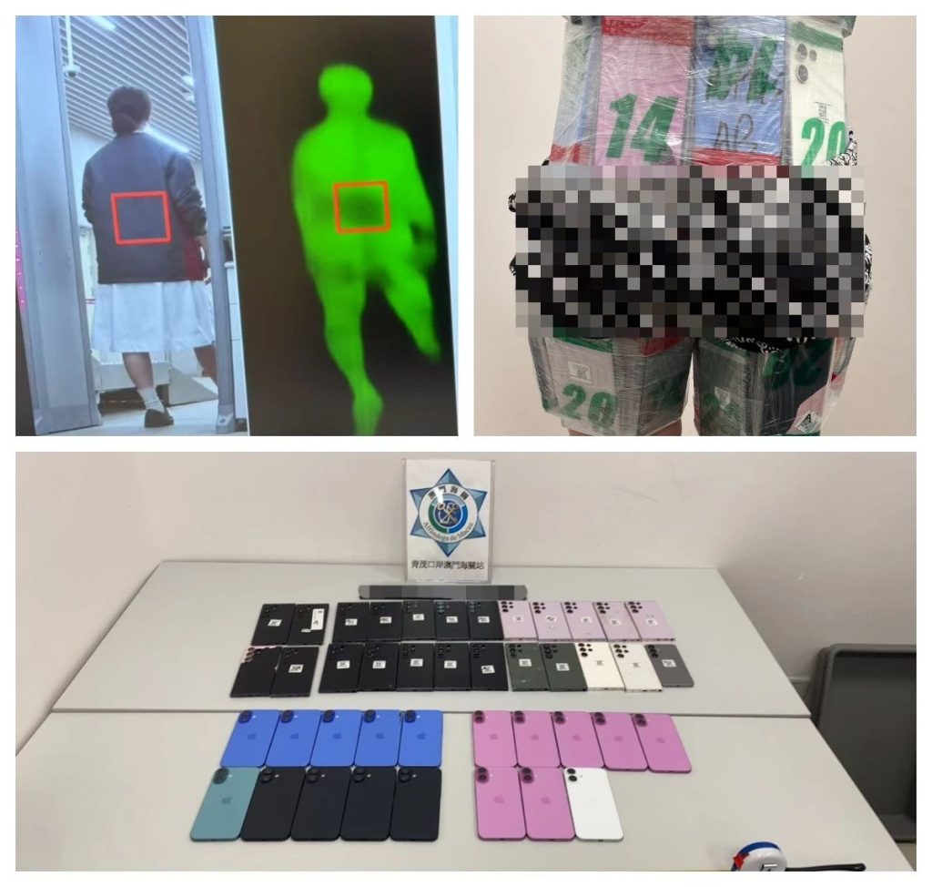 于6月25日晚上,海关人员在青茂口岸出境旅客检查区发现一名可疑女子,步态异常,怀疑藏有可疑物品。经对其进行详细检查后,发现该名女子将42部旧手提电话缠于腰间及腿部,试图偷运出境。