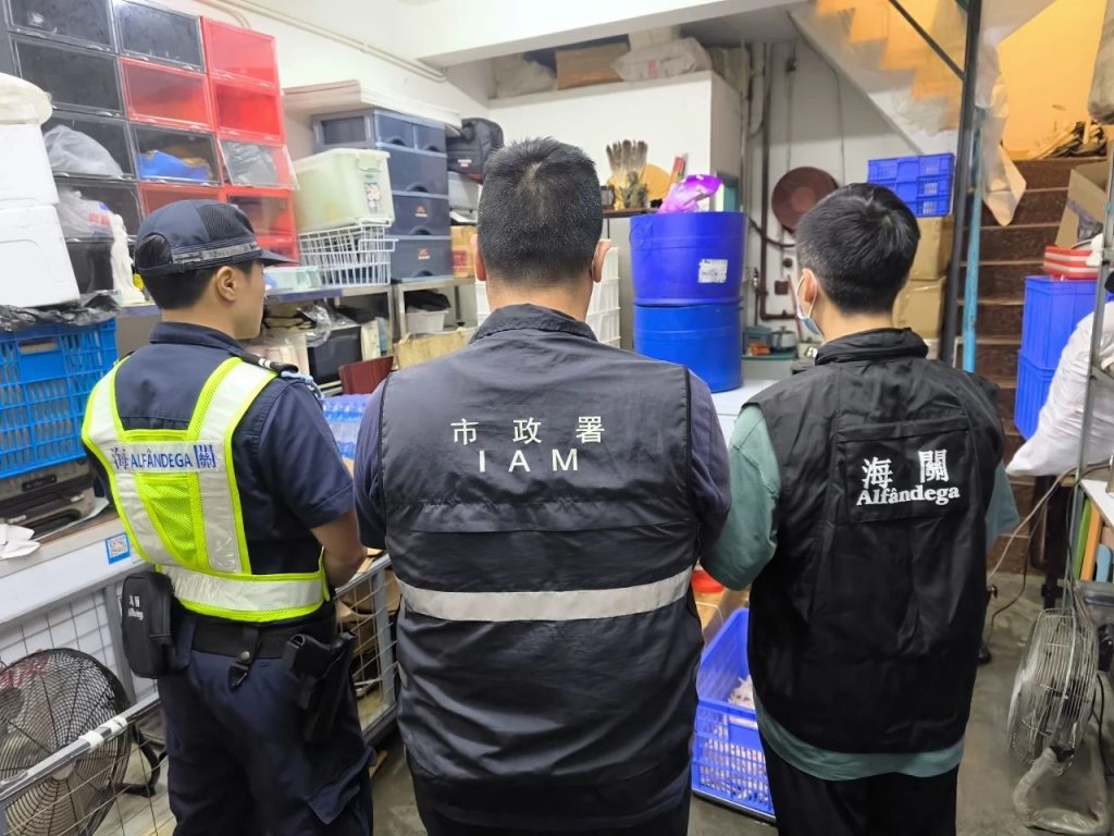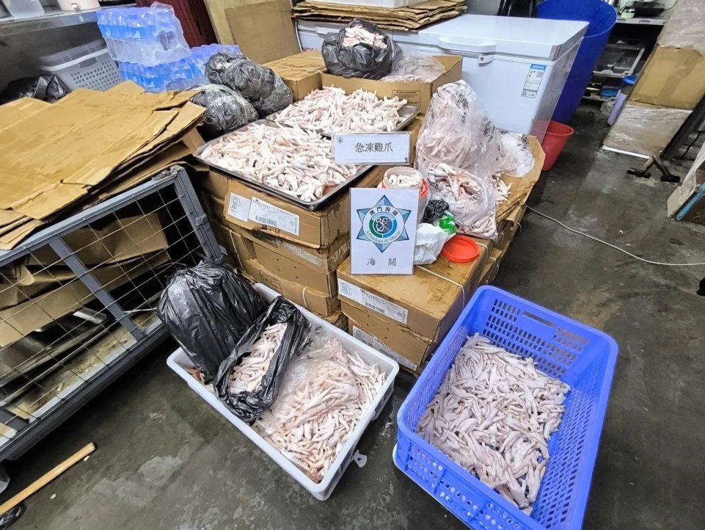 在警察总局统筹下,澳门海关持续进行【雷霆2025】行动。于8月5日下午,海关于市内巡查期间发现北区一个怀疑水客活动散货点,实时对有关店铺采取行动,查获急冻鸡爪约500公斤,货物市值约2万5千澳门元,1人违法被查。