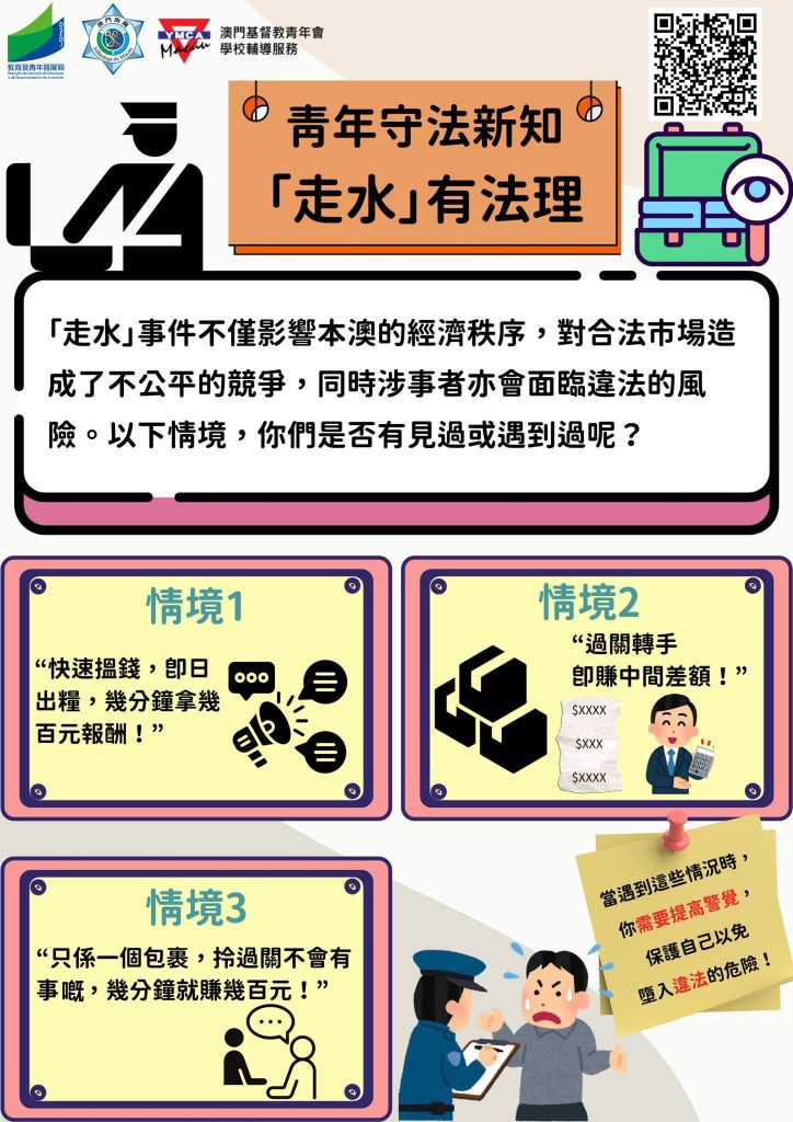 A fim de reforçar a consciência dos jovens estudantes sobre o cumprimento da lei, especialmente durante as férias de verão, a Direcção dos Serviços de Educação e de Desenvolvimento da Juventude (DSEDJ), em conjunto com os Serviços de Alfândega da RAEM, realizaram uma campanha de sensibilização na comunidade na zona das Portas do Cerco, alertando os jovens estudantes para que tenham cuidado com as ofertas ilícitas e não participem em actividades de tráfico ilegal. Ao mesmo tempo, lembraram aos jovens estudantes e seus pais que participar em actividades de tráfico ilegal acarreta consequências legais, não só afectando o seu próprio futuro, mas também podendo causar impactos negativos para a família e a sociedade. Os pais devem dar o exemplo, estabelecendo um bom modelo para os seus filhos, e juntos recusar as tentações dos criminosos.
