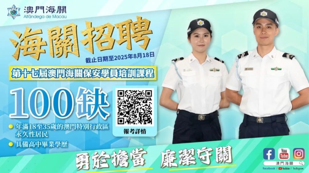 Os Serviços de Alfândega da RAEM(SA) estão a recrutar 100 alunos para o curso de formação. Após a conclusão do curso e aprovação nas provas, os alunos poderão ser contratados como verificador alfandegário da classe de agentes do quadro de pessoal alfandegário dos Serviços de Alfândega. Os interessados em se inscrever podem escanear o código QR abaixo para obter mais informações sobre o processo de inscrição e se inscrever online através da Conta Única.