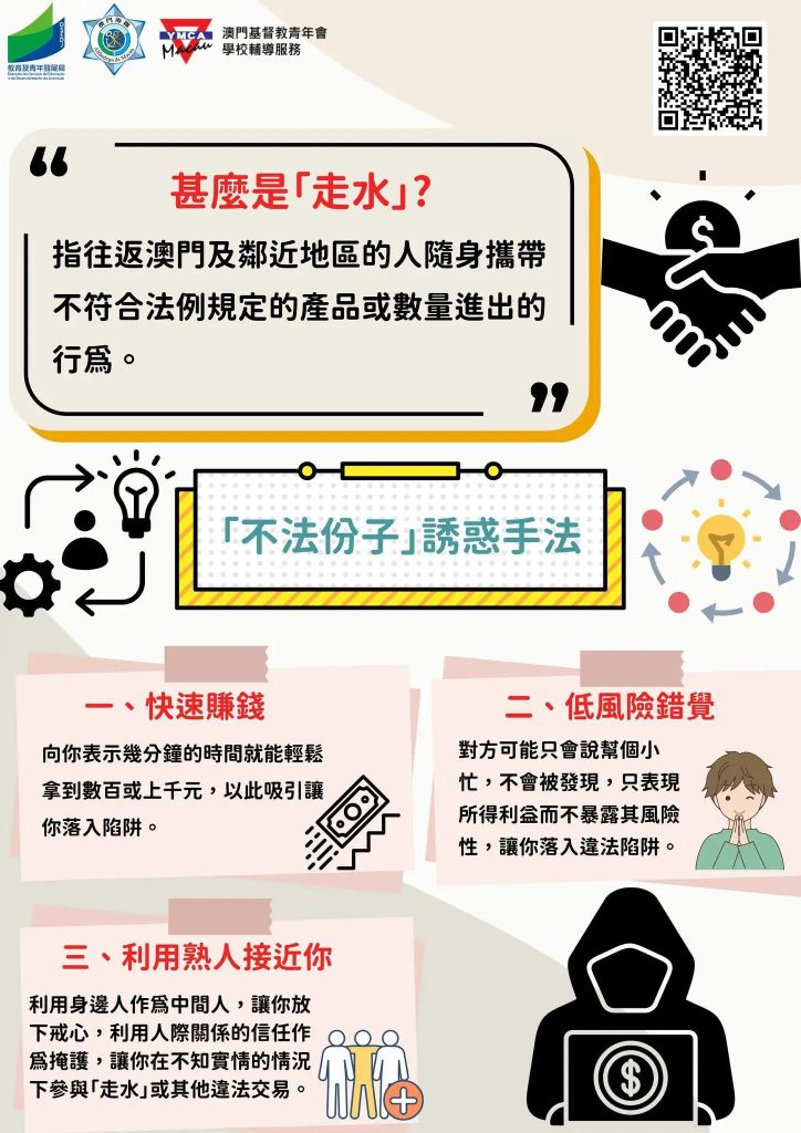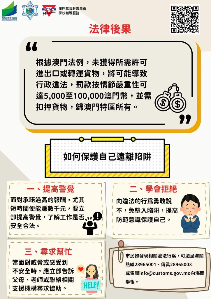 為加強青年學生的識法守法意識,提高警覺,教育及青年發展局聯同澳門海關於新學年前開展跨部門合作,在關閘口岸一帶進行社區推廣活動,提醒青年學生及其家長慎防不法份子的誘騙,切勿參與不法販運活動行為,否則需要承受法律後果,不僅影響自身前途,還可能對家庭和社會造成負面影響。家長應以身作則,為子女樹立良好榜樣,共同拒絕不法份子的利誘。