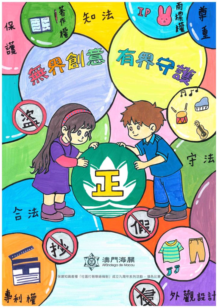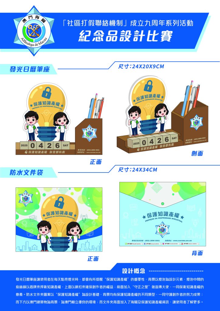 為慶祝“社區打假聯絡機制”成立9周年,澳門海關舉辦紀念品設計比賽、海報設計比賽及填色比賽,以創意形式宣揚保護知識產權的理念,推廣保護知識產權的重要性,提高公眾的守法意識。所有參賽作品已完成評審,頒獎儀式將於9月21日(星期日)下午3時在澳門科學館會議中心舉行。