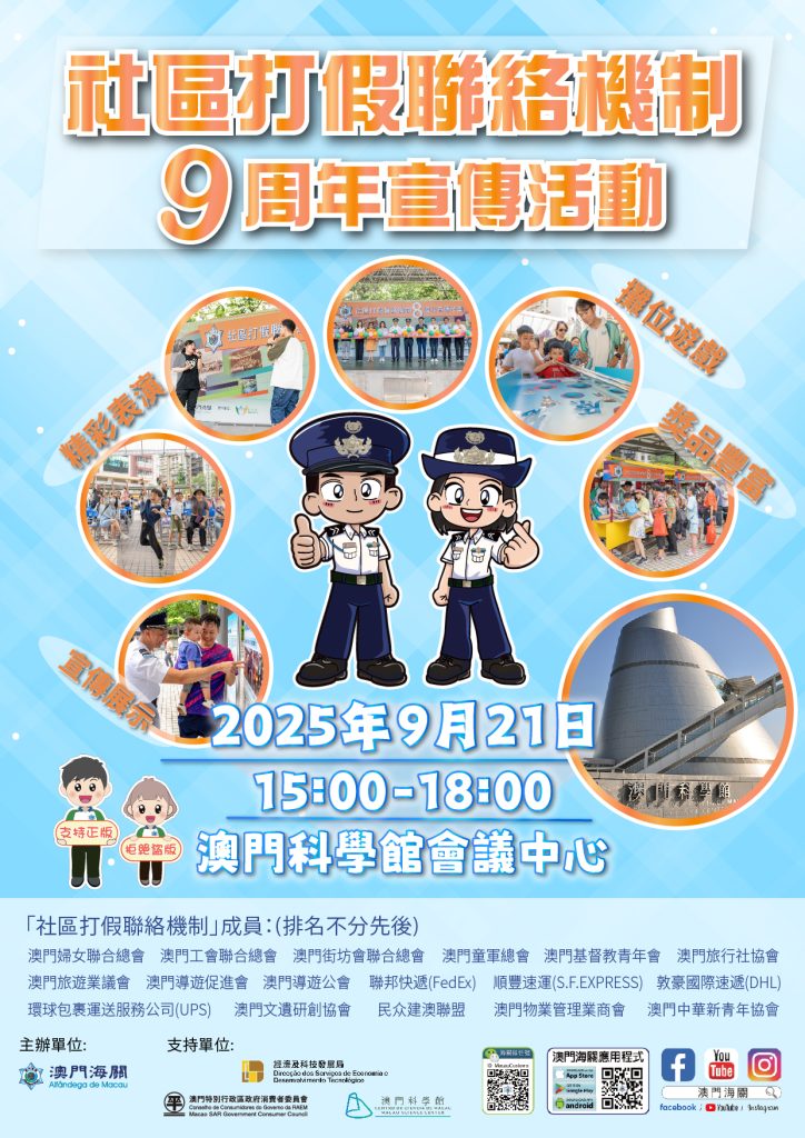 Este ano marca o 9.º aniversário da criação do “Mecanismo de Comunicação Comunitária para combate aos Produtos Contrafeitos” pelos Serviços de Alfândega de Macau. Para promover ainda mais a ideia de protecção da propriedade intelectual e elevar a consciência da população sobre o cumprimento da lei, os Serviços de Alfândega realizarão uma actividade de divulgação às 15 horas de domingo, dia 21 de Setembro, no Centro de Convenções do Centro de Ciência de Macau.