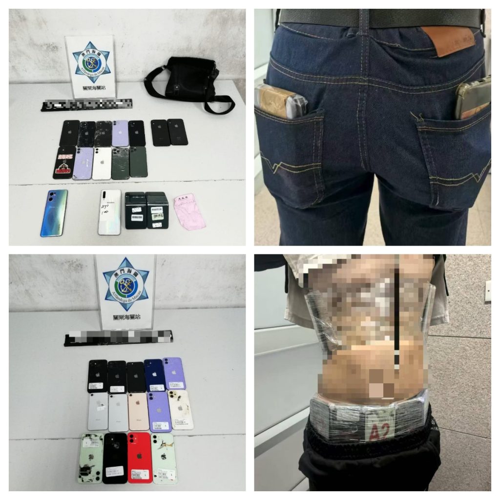 同日,海關人員在關閘口岸出境旅客檢查區先後發現兩名男子,兩人通關時步態異常,神情緊張,懷疑藏有未申報物品。經檢查,發現一名男性內地居民將16部舊手提電話分別藏於身體多處,另一名男性澳門居民則將14部舊手提電話纏於腰部,試圖偷運出境。