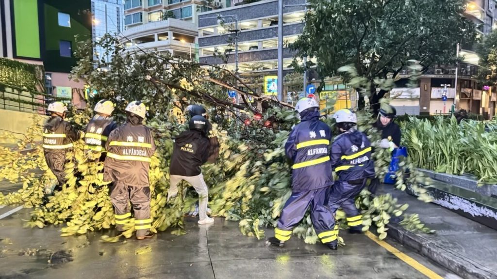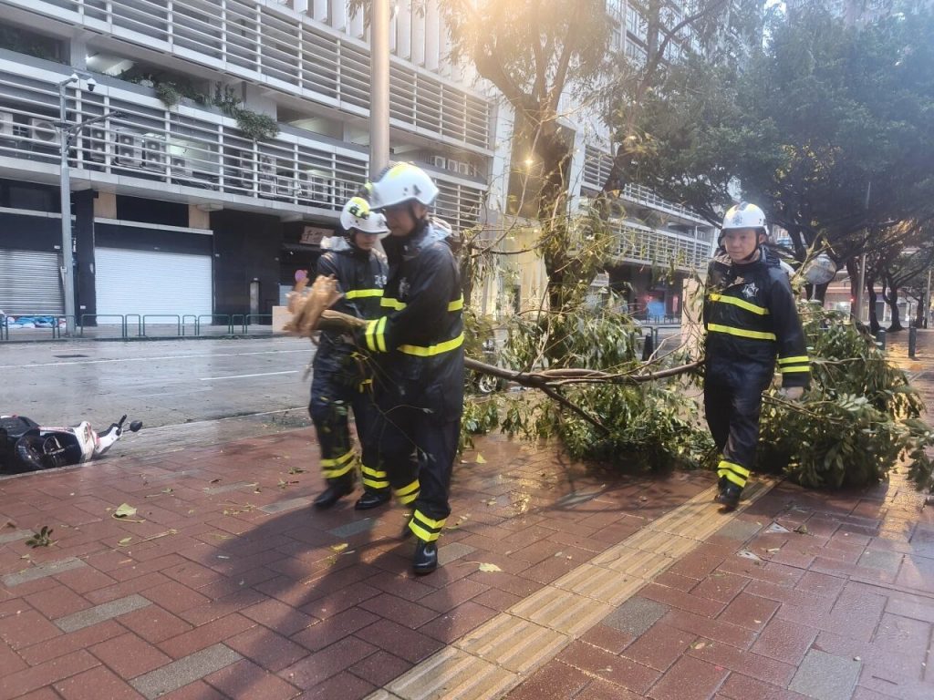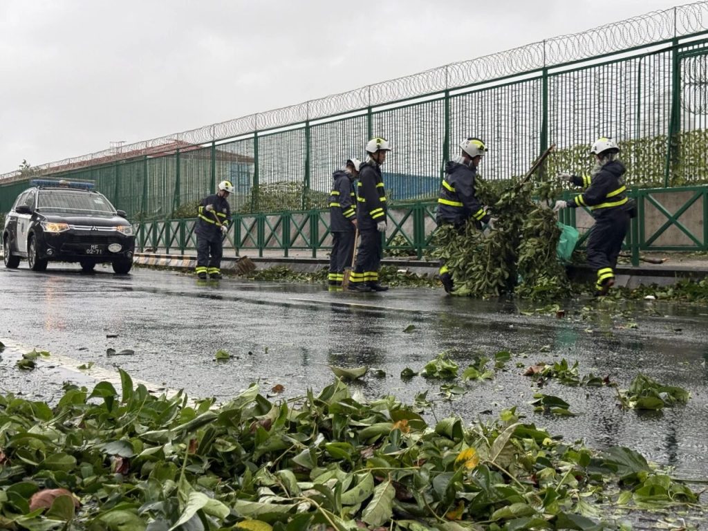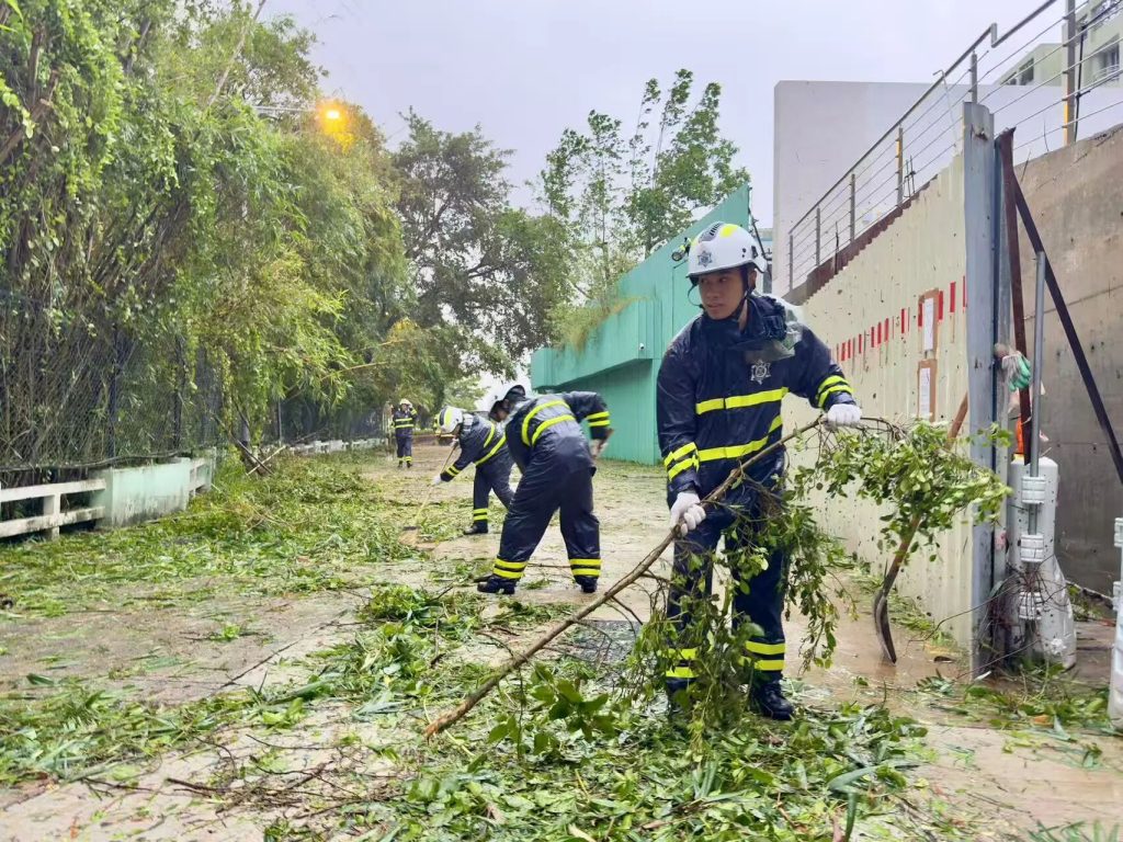 “樺加沙”造成本澳多處道路樹木倒塌和雜物阻塞,海關人員開展清障工作,盡快恢復市面正常交通。