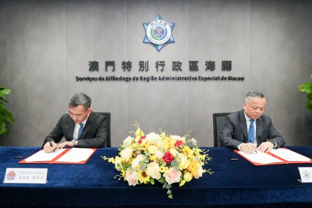O Director-geral dos SA, Adriano Marques Ho e o Vice-Director do Departamento de Nanhai da Guarda Costeira da China, Wu Youlin assinaram conjuntamente a “Acta da Reunião de Cooperação em Matéria de Aplicação da Lei entre o Departamento de Nanhai da Guarda Costeira da China e os Serviços de Alfândega da RAEM”