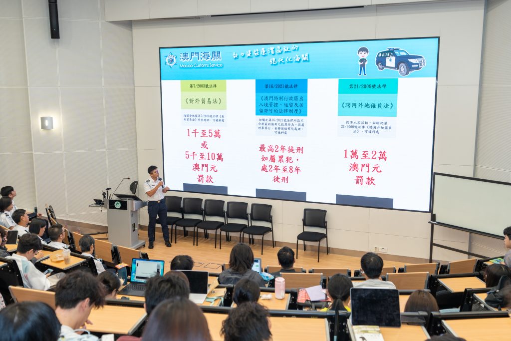 Em virtude de elevar a consciência de prevenção criminal e cumprimento da lei dos estudantes, os Serviços de Alfândega da RAEM (SA) têm vindo a desenvolver continuamente palestras promocional de divulgação jurídica nas escolas, mantendo uma comunicação estreita e activa com as instituições de ensino. Em 8 de Outubro, os SA organizaram uma palestra temática na Universidade da Cidade de Macau, com o intuito de incutir e fortelecer nos estudantes valores correctos e espírito do primado da lei , contando com a participação de 114 estudantes.