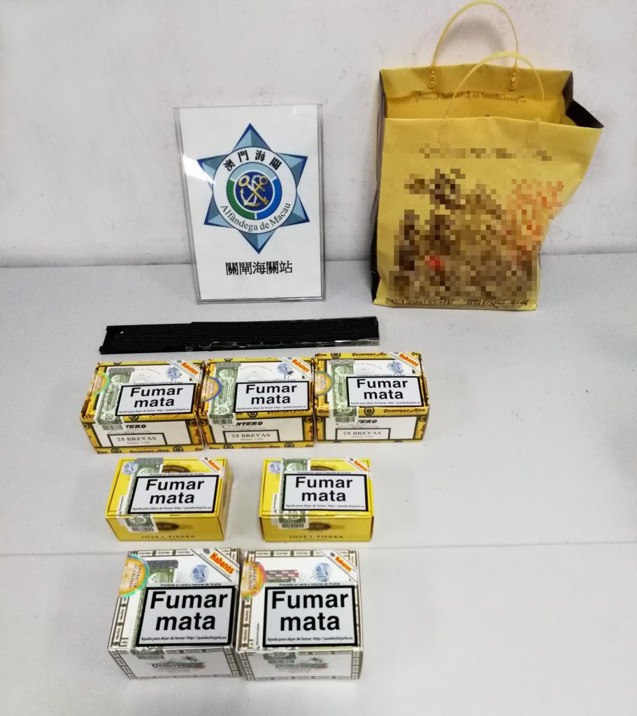 No dia 3 de Outubro, o pessoal dos SA, na área de inspecção de passageiros a sair do Posto Fronteiriço das Portas do Cerco, detectou um residente do Interior da China, do sexo masculino, com ar nervoso. Após inspecção, foi descoberto que o homem escondia aproximadamente 1,365 gramas de charutos nos seus pertences pessoais, tentando contrabandeá-los para fora do território.
