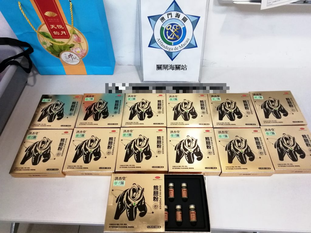 No dia 11 de Outubro, os inspectores dos SA no Posto Fronteiriço de Portas do Cerco, na área de inspecção de passageiros a entrar no território, detectaram uma residente do sexo feminino do Interior da China com uma expressão nervosa. Após verificação, foi descoberto que a mulher tinha escondidos nos seus pertences pessoais 13 caixas de medicamentos contendo espécies em perigo (totalizando 13 gramas), na tentativa de os introduzir ilicitamente no território.