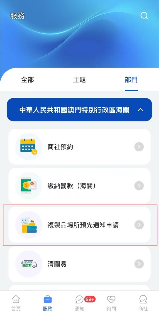 为配合澳门特区政府电子政务发展,澳门海关将“复制品场所预先通知申请”整合至“商社通”,以便利商企提交申请或查询,提升服务的便捷性。