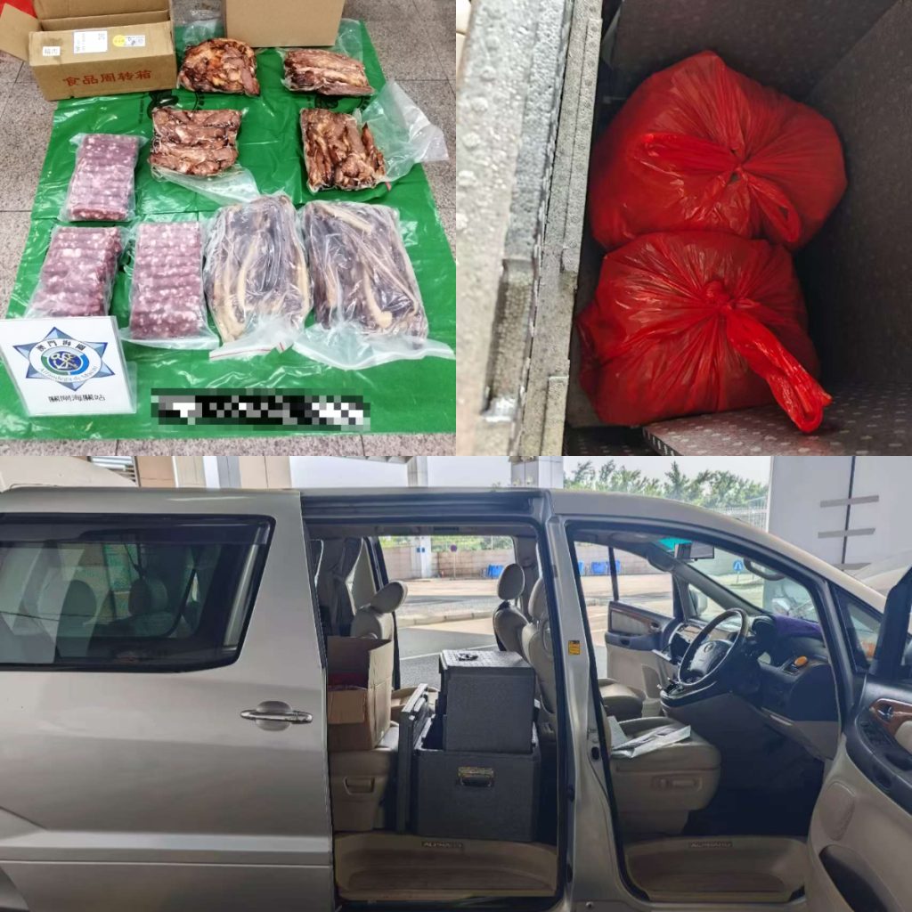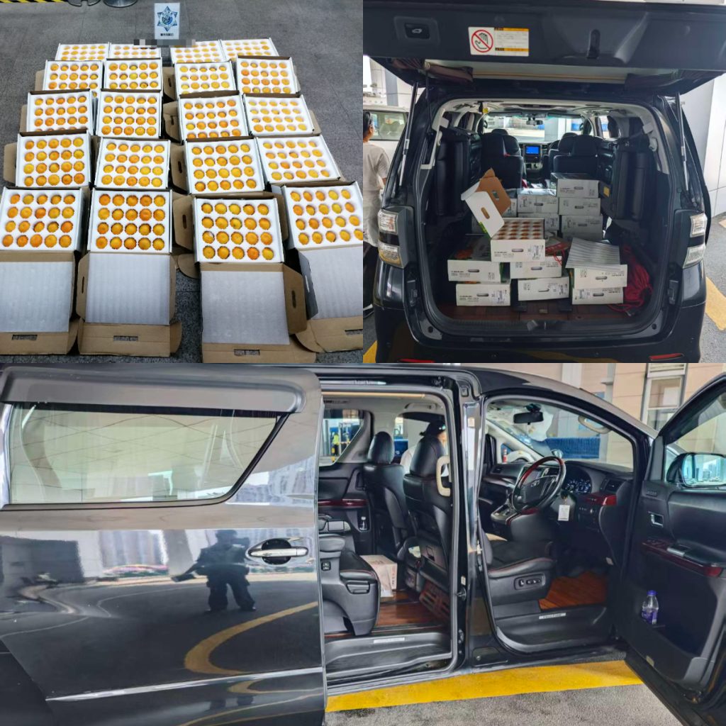 11月9日,海关人员透过风险管理系统的预警布控,在关闸口岸入境车道先后截查两辆跨境车辆,驾驶者分别为男性及女性澳门居民。经检查,发现该男子及女子分别试图将25.3公斤未经申报和检疫的食材及100公斤未经检疫水果偷运入境。
