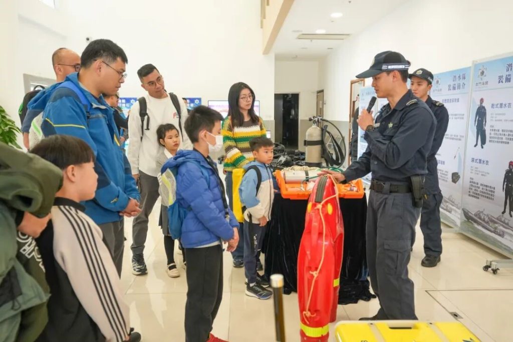 隨後,潛水隊人員向參觀者講解海上執勤與救援的常用裝備,包括通訊和潛水器材、無人探測船及水上電單車等,並讓參觀者近距離接觸相關装備,加深大家對海上救援工作的認知。