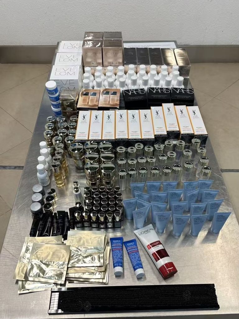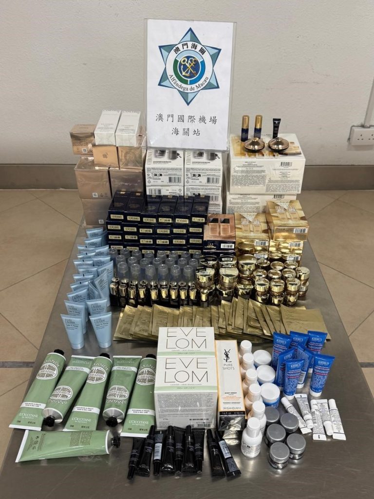11月28日,海关人员在澳门国际机场客运站发现两名搭乘同一航班的男性内地居民形迹可疑,经检查,发现该上述人士将509件美妆产品藏在随身行李内,试图将之偷运入境。