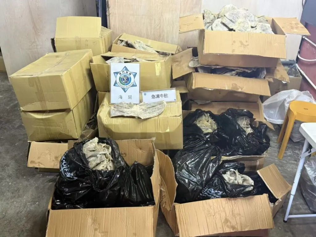 澳門海關根據“水客”活動態勢,加強巡查“水客”散貨點,持續打擊“水客”活動。12月30日,海關人員在北區巡查期間發現一個懷疑“水客”活動散貨點,即時對有關單位採取行動,查獲急凍牛肚約270公斤,貨物市值約8,600澳門元,一人涉嫌違法被查。