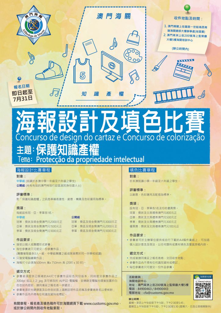 為慶祝「社區打假聯絡機制」成立兩周年,澳門海關舉辦「保護知識產權」海報設計及填色比賽,推廣保護知識產權的重要性,提高公眾對尊重知識產權的意識。報名日期由6月14日至7月31日,比賽獎品豐富,歡迎本澳學生及市民踴躍參與。
