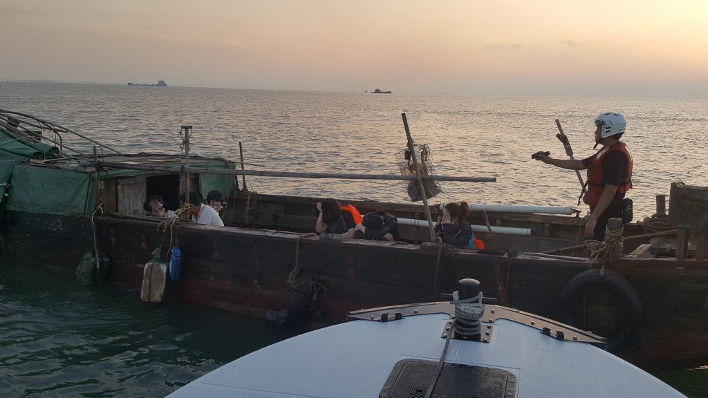 Cerca das 05H00 da manhã de 14 do corrente mês, logo que os SA receberam a denúncia de um cidadão sobre uma embarcação suspeita de practicar as actividades de imigração clandestina junto do Terminal de combustíveis em Ká-Hó, enviaram os verificadores alfandegários de patrulha, bem como os Botes rápidos, para proceder à sua intercepção na zona litoral e marítima. Foi encontrada pelo Bote rápido dos SA uma embarcação motorizada de madeira na área marítima à frente do terminal de combustíveis referidos com 5 indivíduos do sexo masculino e 2 do sexo feminino, e mais tarde 2 imigrantes clandestinos foram também interceptados pelos verificadores alfandegários na área litoral próxima.