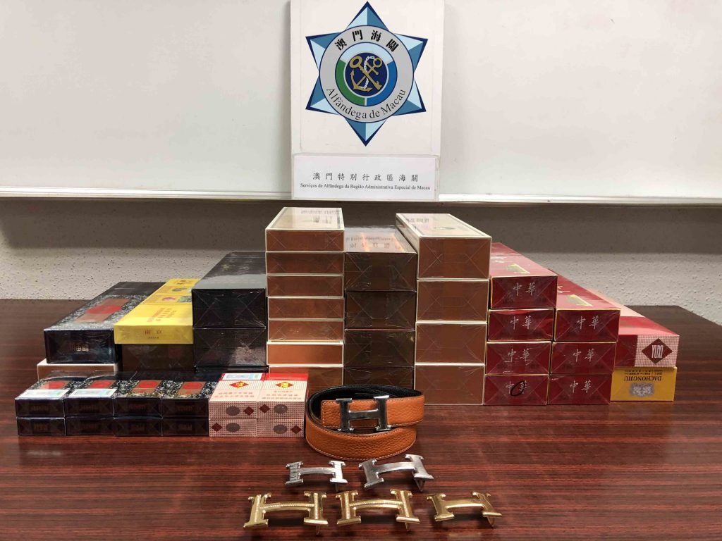 海关经过调查,於本月7日采取行动,先後搜查皇朝区两间店铺,在其中一间店铺内缉获六件怀疑假冒知名品牌物品,包括5个皮带扣以及1个皮带扣连皮带,有关物品若以正价出售,约值澳门币41万。海关与卫生局控烟办人员亦在店内查获未完税香烟3,680支,而在区内另一店铺亦搜出2,960支未完税香烟。