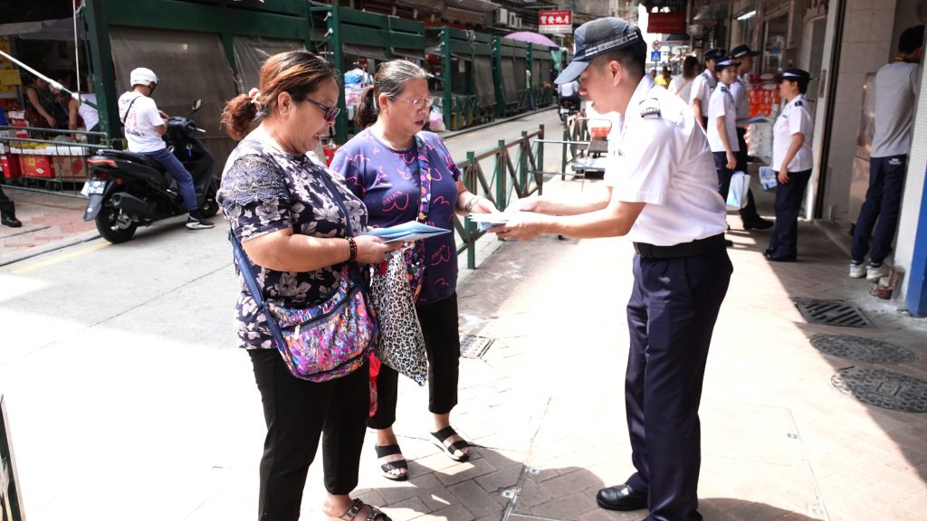 海关人员今日分别前往河边新街、妈阁及下环一带,向居民及商户派发“颱风期间风暴潮低洼地区疏散撤离计划”宣传品,讲解风暴潮的分级、撤离程序及避险中心位置等资讯,期望有关计划启动时,市民能配合相关部门指示,安全有序地进行撤离。海关亦提醒市民,颱风来临前,应预先贮备足够的物资及做好防风措施,包括锁好门窗、加固家中物件及将物品移至高处,同时应密切留意电台、电视台的消息,以掌握政府发布的最新资讯,从而作出应对。