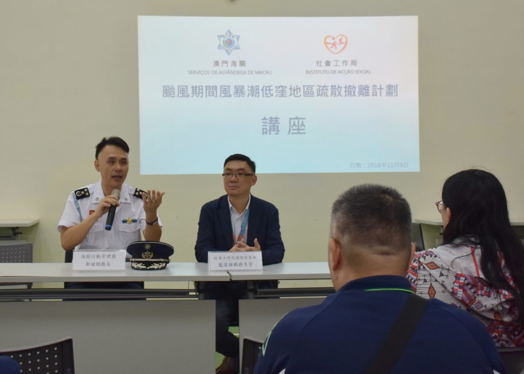 於講座上,海關人員向參與者講解颱風來臨前應做好的準備,包括事先加固門窗、把花盆等雜物移往安全位置,同時亦要貯備足夠及適量的生活及防災物資。在懸掛颱風期間,應密切留意電台及電視台的官方消息,並留在安全地方避免外出,當政府啟動撤離計劃時,海關會派出巡邏車於街上進行廣播,需要撤離的人士應選擇合適的撤離路線,並遵照現場的警務人員指示撤離至安全地方或就近的避險中心,同時建議市民預先熟習撤離路線。社會工作局的代表亦就集合地點、緊急疏散停留點、避險中心設施及配套等向參與者講解。最後,海關及社會工作局的人員亦向參與者講解颱風“山竹”救災及災後的清障工作。