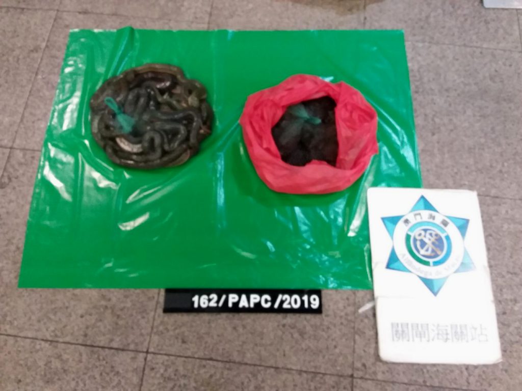 17日下午,一名本地居民经关闸口岸入境时,关员见其自行车载有货物,感到可疑,经检查后,发现其车载物品中藏有未具准照、未经检疫的活蛇和活田鸡,分别重4.5公斤及5公斤。