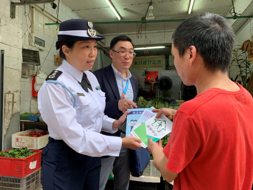 講座結束後,警察總局、海關及社工局一眾人員,聯同坊會及團體代表一同前往下環區宣傳“颱風期間風暴潮低窪地區疏散撤離演習”,向區內商戶及居民派發宣傳單張及防災知識小冊子,提醒市民於颱風來臨前做好準備。